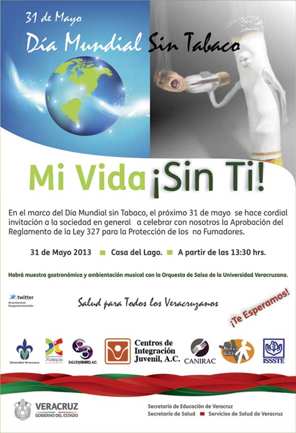 Secretaría de la Rectoría Invita a la comunidad universitaria al evento de celebración del Día Mundial sin Tabaco, organizado por una coordinación interinstitucional, que se efectuará el viernes 31 de mayo, a partir de las 13:30 hrs., en la Casa del lago UV , donde habrá una muestra gastronómica y la presentación de la Orquesta de Salsa de la Universidad Veracruzana.