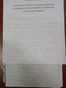 He aquí que el resultado fue el mejor de lo esperado: en el bloque del capítulo leído se hablaba de las modalidades cualitativas, de las distintas metodologías para investigar, así como el tipo de conocimiento que se genera, en donde se enfatizaba la necesidad de distinguir entre la realidad externa propia del positivismo y el realismo interno afín al método comprensivo. Y es que al pedir voluntarios para leer lo que habían descrito, fue grande la sorpresa entre todos la forma de apropiarse de ese trozo de realidad de cada uno de los tres voluntarios, pero sobre todo del primero de los estudiantes.