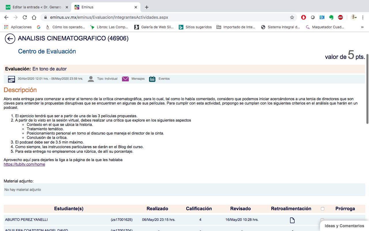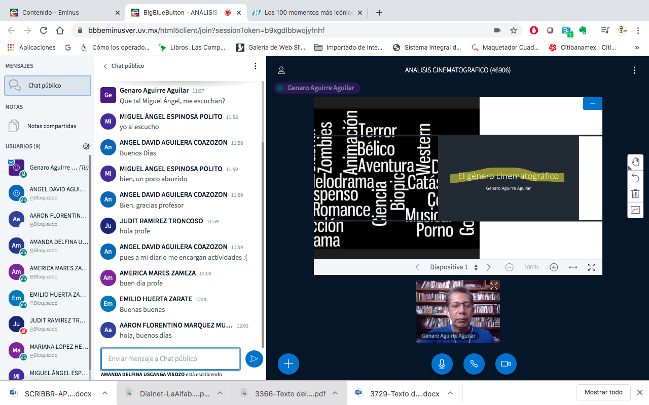 Si a algo hemos estado cercanos en esta etapa de confinamiento, es a lo que algunos autores llaman «Transmedia pedagógica», pues al emplear EMINUS como una plataforma matriz para sesionar sincrónicamente (o de despegue, como a veces les digo y escribo), lugar donde se concentran las instrucciones para la realización de cada actividad, el sitio donde formalmente comparto fuentes de consulta y apoyo, sea en texto o video, particularmente; donde debo destacar el empleo de secuencias claves o memorables. en la historia del cine. A continuación el blog, espacio al que ligo desde EMINUS, y que empleo para contexualizar el ejercicio que haremos en la semana: allí abordo el tópico que conduce a la selección de la corriente cinematográfica, el género o el director del que quiero se haga el análisis. Después realizó algún apunte sobre la película que quiero que vean (suelo confirmar que está en línea, por lo que sólo una vez se las he compartido a través de One Drive).