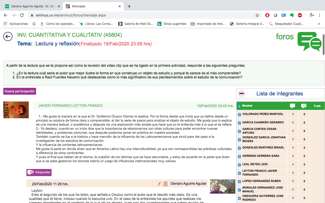 En el caso nuestro, el empleo de EMINUS en su versión 4.0 ha venido a confirmar la pertinencia de una plataforma propia que ofrece una serie de herramientas para diseñar itinerarios de aprendizaje que favorezcan la adquisición de tales saberes. Y ello -precisamente-, es lo que percibo ha entendido este grupo, quien a los largo de cada una de las sesiones sincrónicas virtuales, a excepción de un par de estudiantes, estuvieron todos, lo mismo para el cumplimiento de actividades que para la participación en los foros que abrimos, como en las sesiones de conversación que se implementaron en Zoom o bien para emplear algunas plataformas sugeridas en el contexto de la entrega de sus evidencias de aprendizaje.