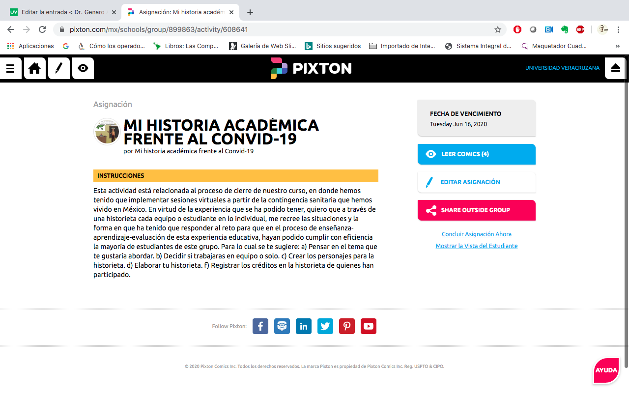 En ese contexto, la Universidad Veracruzana implementó una serie de políticas y medidas encaminadas a generar condiciones para que docentes y estudiantes pudiéramos dar continuidad al trabajo que veníamos haciendo en cada una de nuestras experiencias educativas. Tal es el caso de las experiencias que en este periodo imparto, dos de las cuales ya he tenido ocasión de reseñar en este mismo espacio, pero ahora quisiera hablar de una que, me ha dado particular satisfacción, por la manera en que el 99 % del grupo entendió la responsabilidad y actitud para llevar a ambientes virtuales un proceso educativo tradicionalmente presencial.