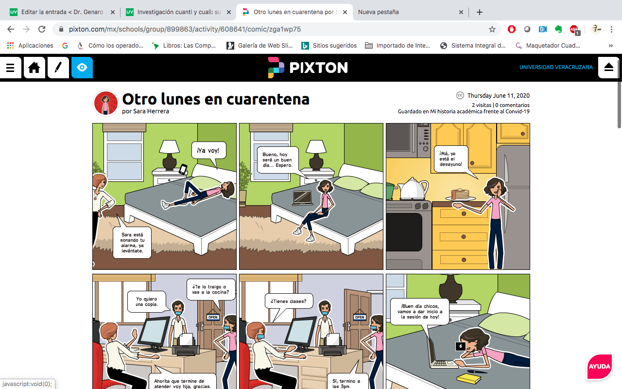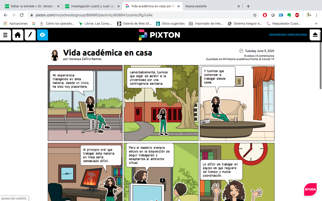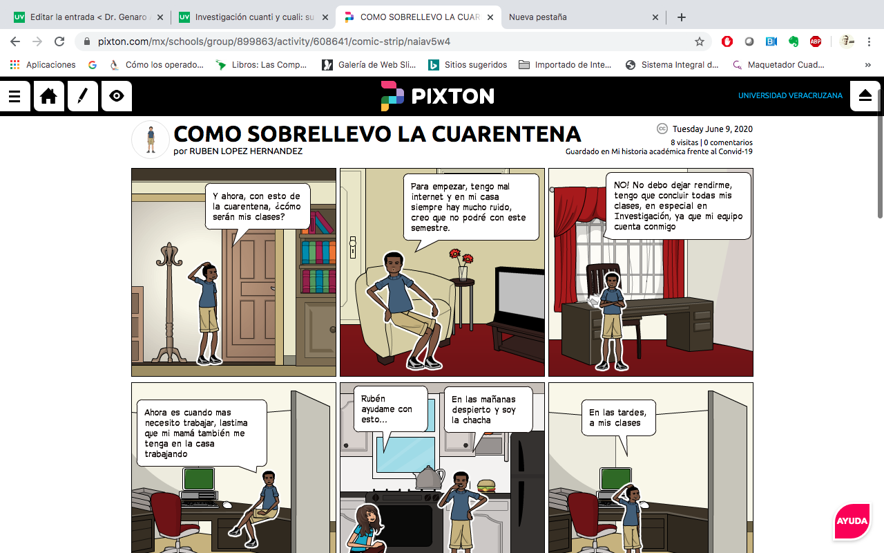 Si esto fuera poco, propuse a los estudiantes que, en lo individual, alaboraran una historieta donde ellos recapitularan la experiencia que han tenido en el contexto de esta pandemia, para lo cual están empleando una plataforma que tengo contratada para la elaboración de este tipo de productos educativos. Construcción del objetivo de estudio, estado del conocimiento, marco epistémico, justificación, fundamentación teórica, diseño metodológico mixto, técnicas de investigación y fuentes de referencia, fueron los elementos básico que compuso un proyecto revisado en Word, pero entregado en cartel científico. Interesante es hablar también que desde el proyecto cuantitativo, se habló sobre la importancia de saber emplear las fuentes de referencia, además del empleo de un gestor de referencia en línea, así como contar con el Manual APA en línea, para resolver dudas al respecto de la forma de trabajos sus fuentes.