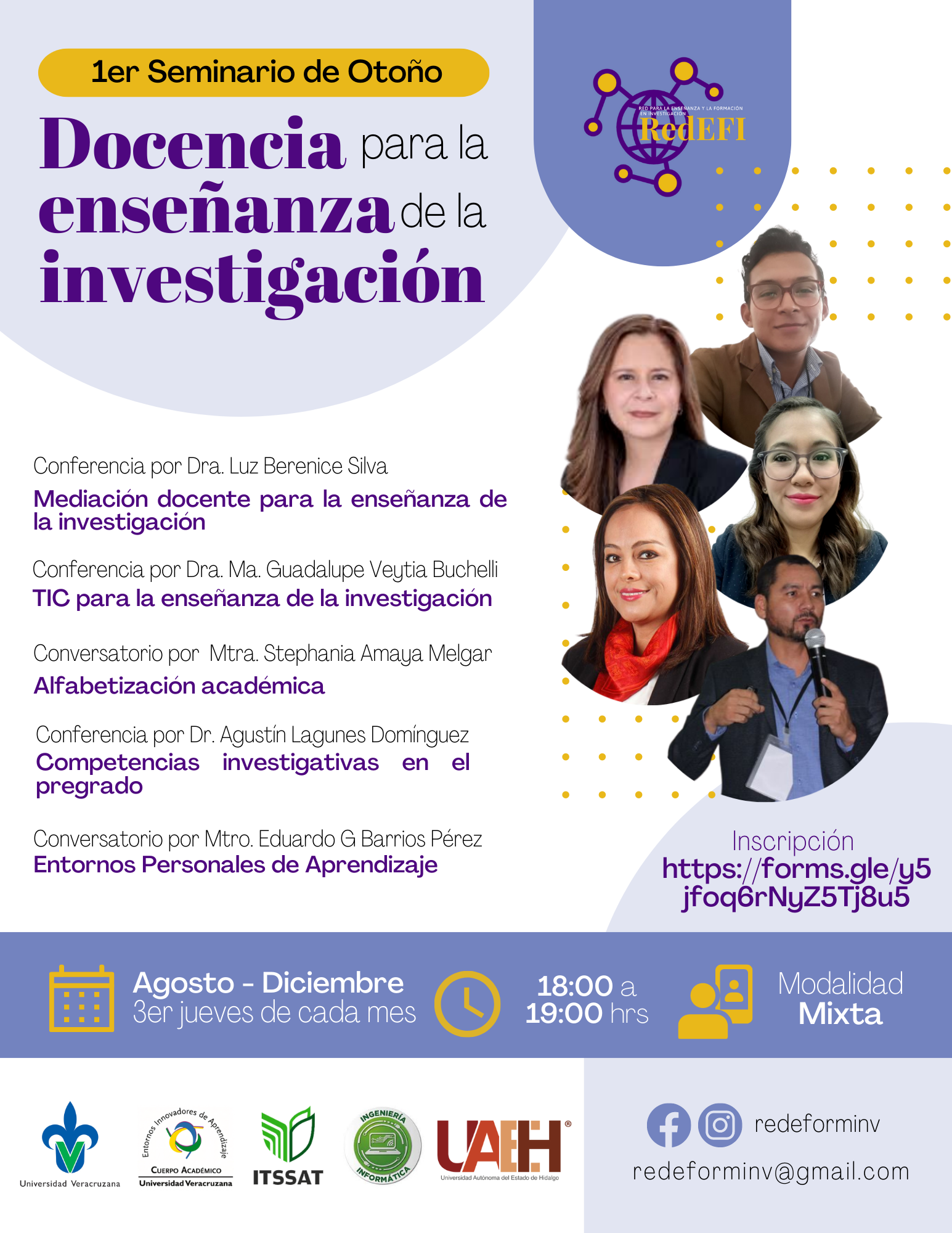 Este seminario, que ha iniciado en agosto pasado, y tiene como intención ser un espacio de diálogo y formación que favorezcan el intercambio de experiencias y estrategias para el desarrollo de competencias docentes orientadas a la enseñanza de la investigación en la educación superior, preferentemente; para lo cual se gestionó para que fuera la Facultad de Ciencias y Técnicas de la Comunicación de la Universidad Veracruzana, la sede de este primer ciclo de actividades académicas que vertebran una propuesta declarada en su modalidad mixta.