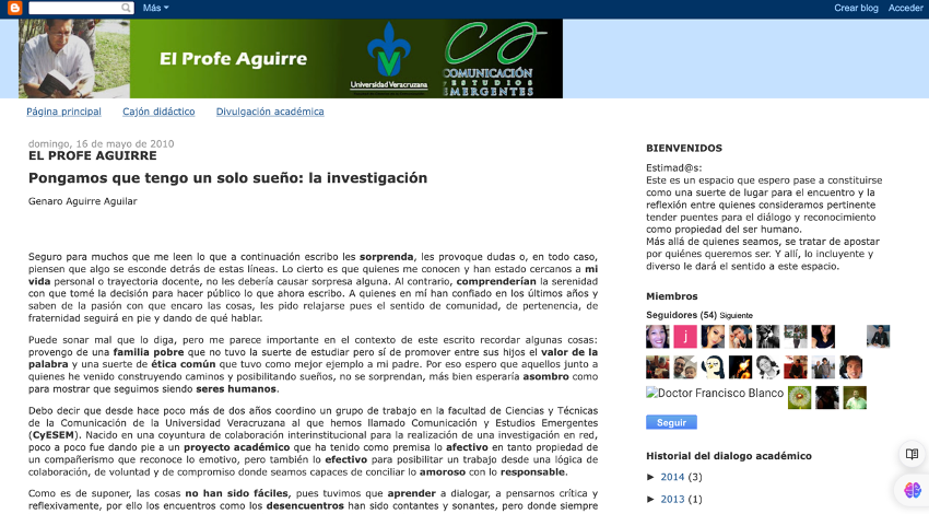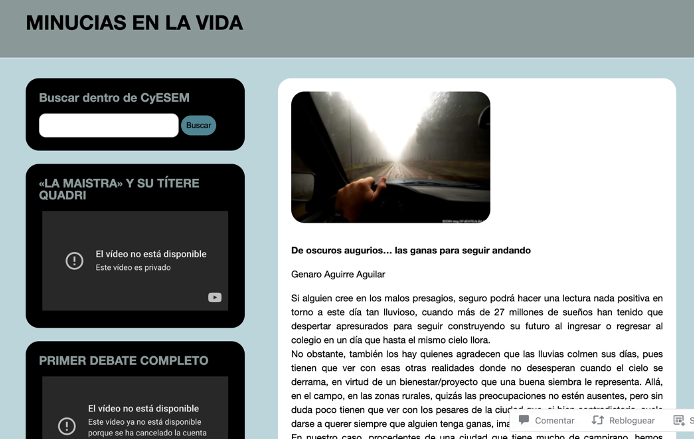 Estas experiencias llevaron a crear un espacio digital para que, quienes conformábamos el grupo de colaboración Comunicación y Estudios Emergentes (Cyesem), pudiéramos publicar nuestras reflexiones. En aquel blog, nació mi columna Minucias en la vida, donde -nuevamente- las pequeñas cosas eran aquellas que me permitieran reflexionar sobre esas nimiedades que terminan por hacer grande nuestro lugar en este mundo. Es cierto, ya antes había creado un blog al que llamé elprofeaguirre, para después, dar vida a uno con poca duración al que llamé Cajón de asombro.
