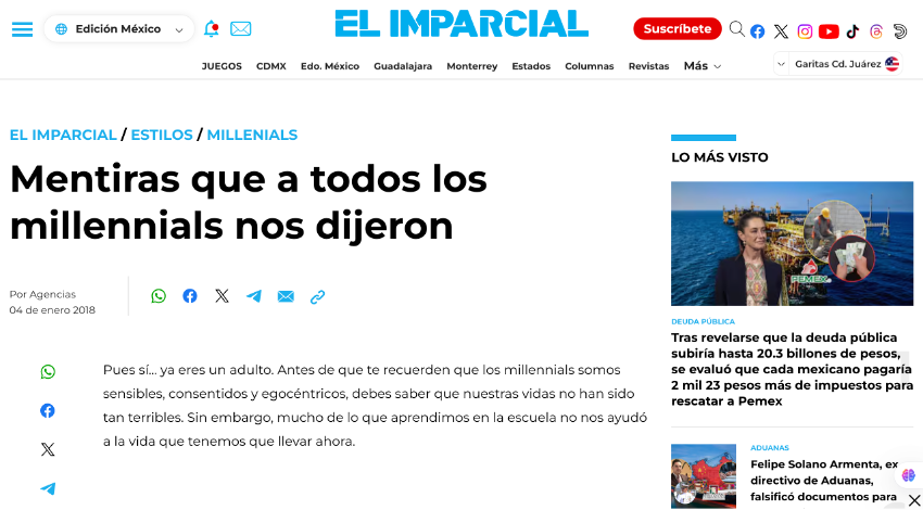 Otra cosa que me gustaría destacar es que el comentario sobre el influencer millenial que habla sobre como se les vendió una «mentira» sobre cómo sería vivir, en realidad no solo parte de la disminución del coeficiente intelectual y el mundo de las redes sociales, también es que, genuinamente, los costos de la vivienda en relación con la paga y la facilidad que antes tenían para encontrar trabajo hace que poder tener un hogar propio sea extremadamente difícil (por no decir imposible), agregando un ejemplo a esto es mi abuelo, él proviene de un pueblo pequeño de Guerrero, estudió un tiempo en la Ciudad de México y eventualmente consiguió un trabajo que le permitió construir una casa en Veracruz Puerto, comprarle una casa a su madre en la CDMX y poder mantener a 5 hijos, mi punto con todo esto es que de cierta manera si nos vendió una mentira a las nuevas generaciones y no todo el peso caería (hablando específicamente sobre este tema) sobre las redes sociales