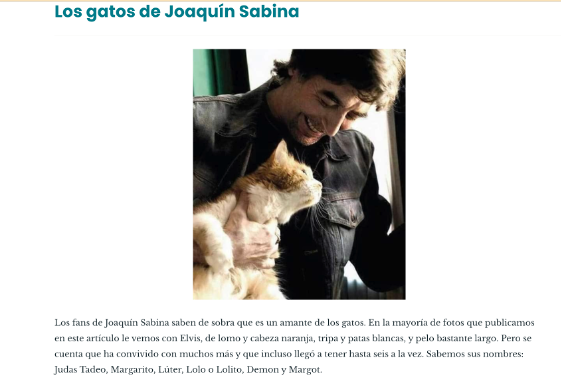 Vamos, el propio Joaquín Sabina (aficionado a los gatos), ha hecho una descripción del porqué los gatos son animales distintos a cualquier mascota, a tal grado que en una de sus canciones los refiere como compañías. Con su característica delicadez nos dice: «Acabaré como una puta vieja, hablando con mis gatos». ¡Vamos!, sus fanáticos saben que en alguna ocasión dijo: «Uno no puede imaginarse a un gato tirándole un hueso quinientas veces y que venga babeando con el hueso. Los gatos van completamente a su aire, son seres libres, son muy domésticos. (…) Ocupan la casa de una manera que tú acabas siendo su siervo y mendigando que te quieran un poquito. Son absolutamente superiores”. Incluso, en el famoso cuento de Edgar Alan Poe, «El gato negro», aborda esa fidelidad que tales animales tienen para con sus dueños, aun con el maltrato y crimen que comente el sujeto protagonista.