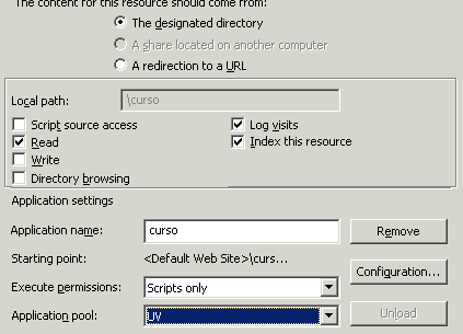 3. Actually this is a 2.5 step because you only have to aislate application on IIS. Open the IIS Management Console and create a new Application Pool. I don’t know, name it «PHP» and leave the defaults. Go to your new WordPress site (in this case “curso”), right click->properties and make it to a web application selecting the Application Pool we just made.