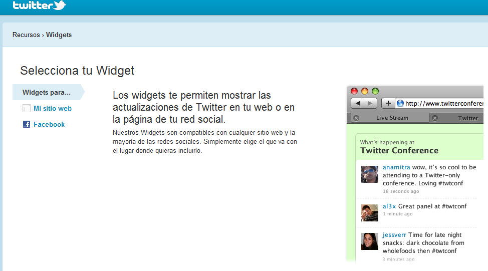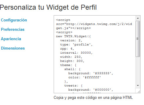 Allí encontraras varias opciones para insertar en tu sitio (no importa si es sobre WordPress o no) accesos a tu cuenta de Twitter.