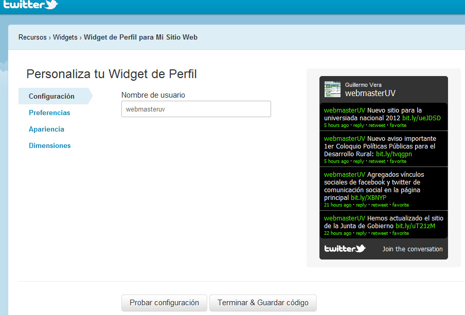 En este espacio es donde podemos crear un widget con las entradas publicadas en nuestro Twitter. Sigue los pasos de esta página y al persionar el botón «Terminar y guardar código», obtendrás las instrucciones de JavaScript a incrustar en tu sitio.