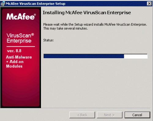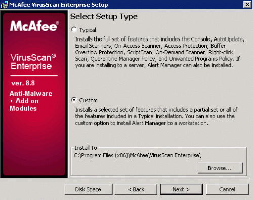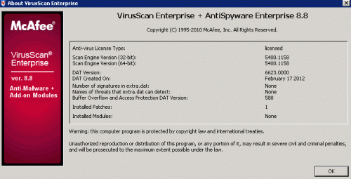 Esta entrada tiene con objetivo servirme de bitácora de instalación de la última versión de McAfee® que tengo disponible para mis servidores Windows 2008 R2, además de la instalación del pache McAfee® VirusScan® Enterprise Version 8.8 Patch 1 referido en el KnowledgeBase article KB65944.
