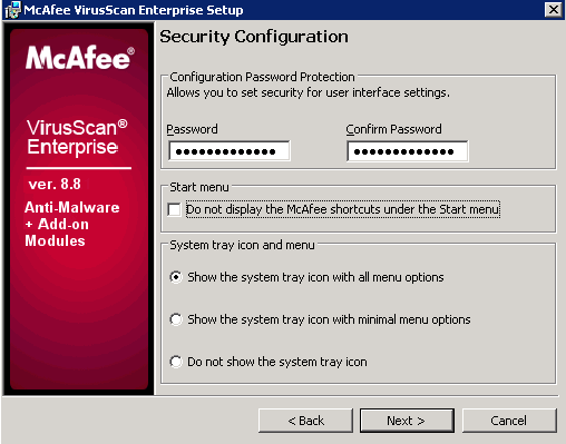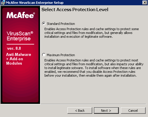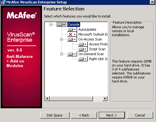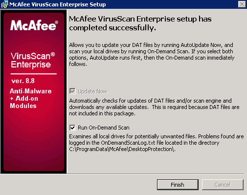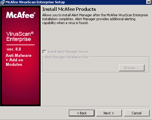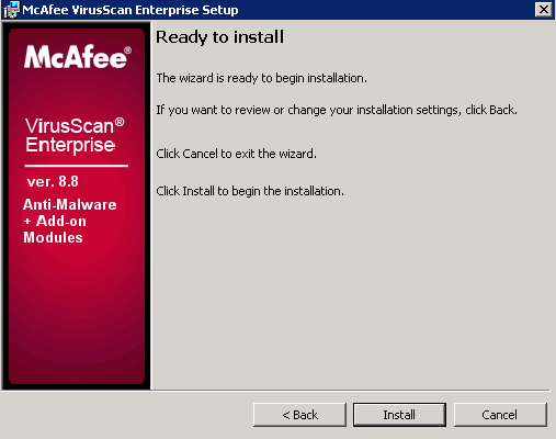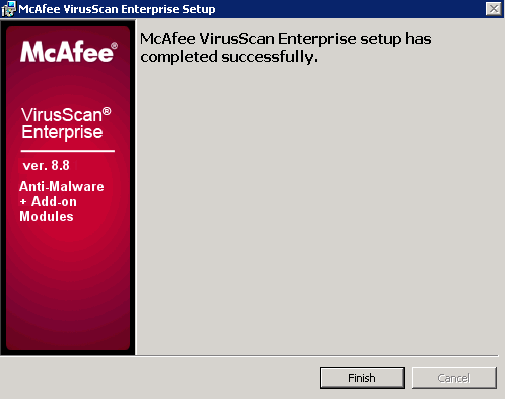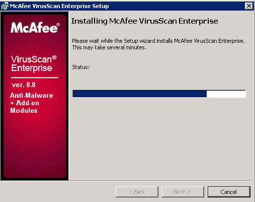 Esta entrada tiene con objetivo servirme de bitácora de instalación de la última versión de McAfee® que tengo disponible para mis servidores Windows 2008 R2, además de la instalación del pache McAfee® VirusScan® Enterprise Version 8.8 Patch 1 referido en el KnowledgeBase article KB65944.