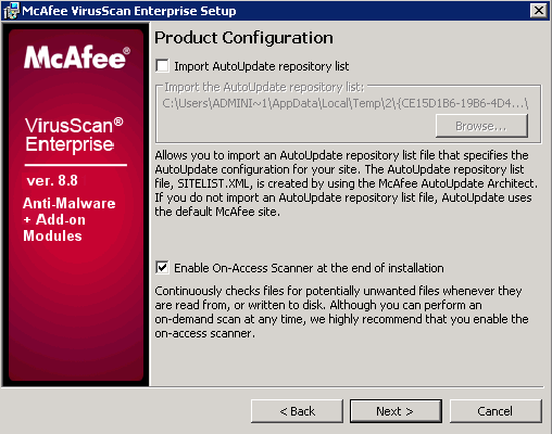 Si ya se tiene un producto de versión anterior y por lo que he alcanzado a leer, yo me recomiendo remover el mismo desde add or remove programs, reiniciar y entonces si, instalar esta última versión. Hay tantas llaves en el registro que el producto agrega, que puede ser que al poner una nueva versión encima de otra me encuentre con problemas en el futuro. En el caso especial de que no se pueda hacer esto, el instalador cuenta con la opción de hacer el upgrade además de que puede respetar las preferencias de configuración de la versión anterior. Pero de nuevo, lo recomendable es que si puedo, hay que desinstalar la versión anterior primero. Más info en McAfee VirusScan Enterprise 8.8 software Installation Guide.