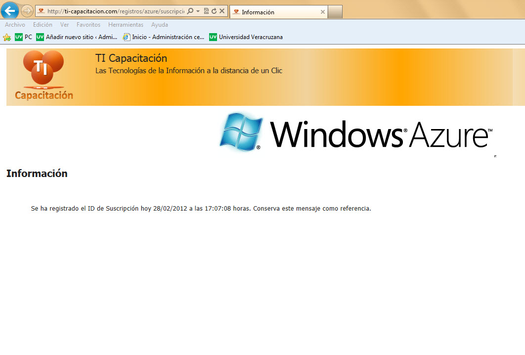 La cuenta de Windows Azure te permitirá realizar tus prácticas por lo cual es obligatoria la realización de esta actividad y tiene un valor del 50% del total de puntos de este entrenamiento.