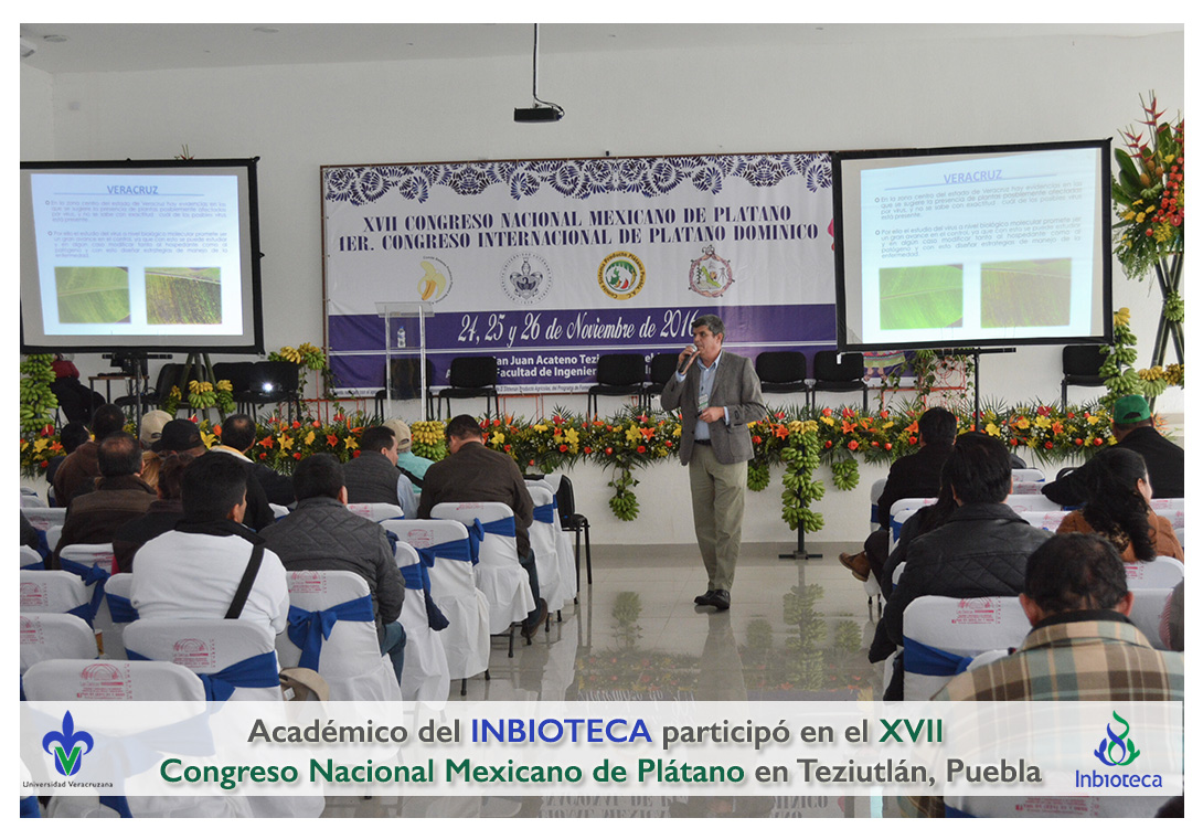 2016-1124. Académico del INBIOTECA participó en el XVII Congreso Nacional Mexicano de Plátano en Teziutlán, Puebla. El Académico-Investigador del INBIOTECA Dr. Juan Carlos Noa Carrazana (SNI I – Perfil PRODEP) participó en el «XVII Congreso Nacional Mexicano de Plátano» y «1er. Congreso Internacional de Plátano Dominico» que se realizó del 24 al 26 de noviembre de 2016 en San Juan Acateno, Teziutlán, Puebla, México.