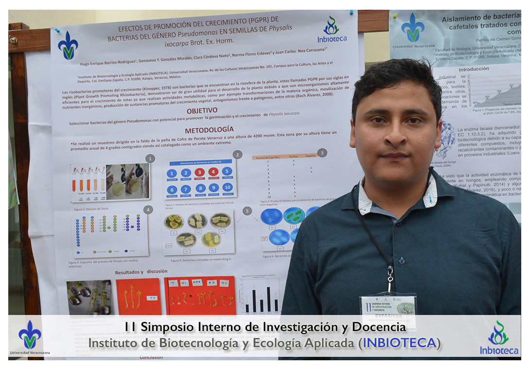 2017-1117.- En el marco 11 Simposio Interno de Investigación y Docencia del Instituto de Biotecnología y Ecología Aplicada (INBIOTECA), el La LGAC Biología Molecular y Fitopatología (BioMolFito) del Cuerpo Académico Consolidado UV-CA-234 «Biotecnología Aplicada a la Ecología y la Sanidad Vegetal» del Instituto de Biotecnología y Ecología Aplicada (INBIOTECA) felicita a Barrios-Rodríguez Hugo Enrique estudiante de la Facultad de Biología de la Universidad Veracruzana, quien realizó la exposición de su cartel «ID-04 Efectos de promoción del crecimiento (pgpr) de bacterias del género Pseudomonas en semillas de Physalis ixocarpa brot. ex. horm» #OrgulloUV #UV_DamosMás