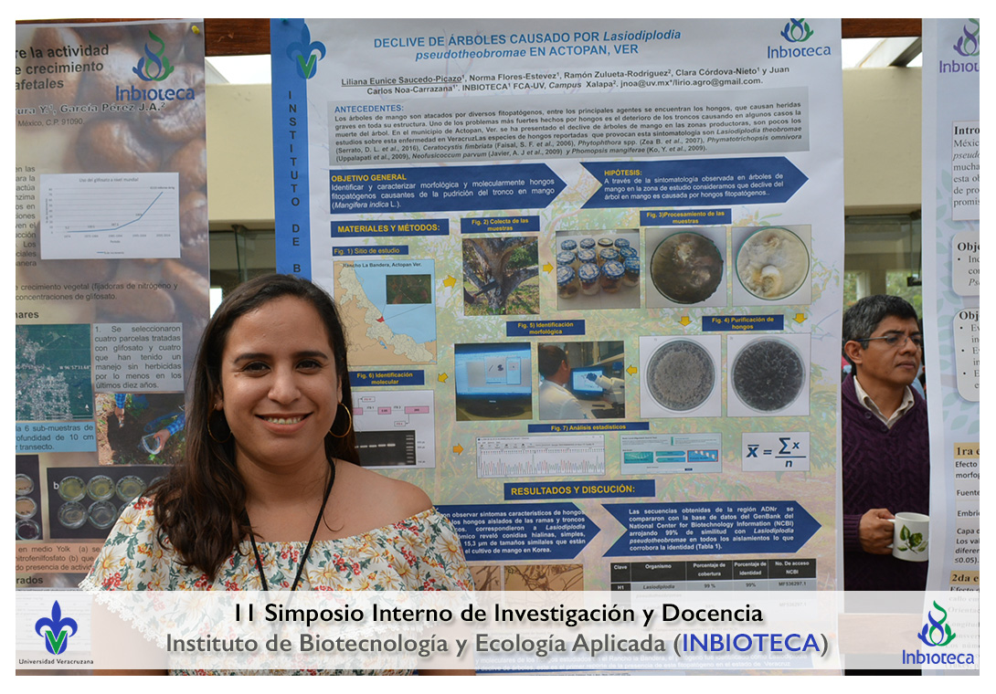 2017-1117.- En el marco 11 Simposio Interno de Investigación y Docencia del Instituto de Biotecnología y Ecología Aplicada (INBIOTECA), la LGAC Biología Molecular y Fitopatología (BioMolFito) del Cuerpo Académico Consolidado UV-CA-234 «Biotecnología Aplicada a la Ecología y la Sanidad Vegetal» del Instituto de Biotecnología y Ecología Aplicada (INBIOTECA) felicita a aucedo Picazo Liliana Eunice estudiante de la Maestría en Ciencias en Ecología y Biotecnología del INBIOTECA, quien realizó la exposición de su cartel «ID-08 Declive de árboles causado por Lasiodiplodia pseudotheobromae en Actopan, Ver.» #OrgulloUV #UV_DamosMás