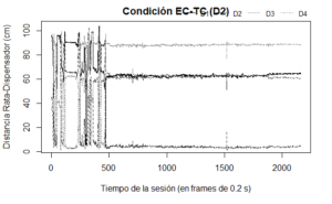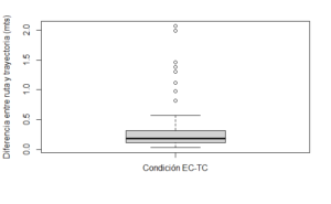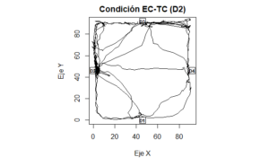 En cuanto al cálculo de las distancias implicadas en las trayectorias ideales desde la posición del organismo al inicio de cada ciclo y la ubicación del objeto de estímulo al final de cada uno de éstos, primero se genera una variable en la que cada valor corresponde al número de frame en el que inicia cada ciclo (inicios). Posteriormente se obtienen las coordenadas de la ubicación al inicio de cada ciclo mediante la función posiciones(), en la que se utiliza la variable generada inmediatamente antes. Es importante destacar que al aplicar la función posiciones(), el resultado es filtrado mediante la función na.omit() para suprimir todos los valores que no corresponden a los inicios de cada ciclo (es decir, todos los valores intermedios). Mediante la aplicación de la Ecuación 1 (véase el manuscrito) se obtiene la estimación de la distancia de cada trayectoria y, finalmente, se calcula el valor absoluto de la diferencia entre cada trayectoria ideal y la ruta de desplazamiento para obtener la distribución de tales diferencias como un indicador de la variación. En el ejemplo mostrado se emplea la función boxplot() para graficar la distribución de las diferencias entre trayectorias y ruta por ciclo. La función axis() permite señalar que en el eje de las abcisas (1), en la posición número 1 se habrá de colocar la etiqueta correspondiente para la gráfica de caja y cejas que se proyecta (labels=c(“Condición EC-TC”)). El segundo y tercer argumento pueden admitir una lista de valores y etiquetas, respectivamente, en el caso de que se incluya más de una gráfica en el plano (como en el manuscrito).
