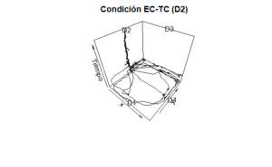 Para representar la direccionalidad de manera tridimensional se emplea la función scatter3D(), en la que se deben especificar los argumentos que se refieren a las variables que designan la posición del organismo en coordenadas X-Y, así como la variable que señala el paso del tiempo (Eje Z). Otros argumentos empleados son: colvar=, el cual es importante que se establezca como NULL para la serie de datos se muestre en un solo color (negro, por defecto); zlab, para escribir los rótulos del Eje Z. La función text3D() es útil para crear gráficos tridimensionales en los que los datos que se muestran son conjuntos de palabras, aunque en el presente código se usan para señalar las coordenadas X-Y-Z, en las que añaden (add=TRUE) las etiquetas que identifican a cada dispensador de agua.