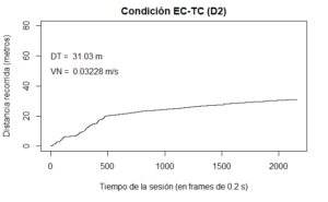 Para representar el vigor se debe aplicar la función distancia() para obtener el cálculo de la distancia recorrida frame a frame. Para graficar el dato es suficiente con usar la función plot(), en la que se señala el paso del tiempo como la variable que establece los datos de las abcisas y el resultado obtenido de la distancia recorrida como la variable para las ordenadas. Ésta última variable debe ir incluida dentro de la función cumsum() para que se muestre la distancia recorrida acumulada a través del tiempo. Se añade con la función text() la descripción de la distancia total recorrida, obtenida mediante la función sum(), así como la velocidad neta, obtenida mediante la función velocidad.neta().