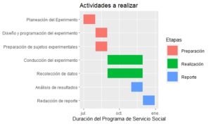 A continuación se ejemplifica la creación de un gráfico de Gantt para representar un cronograma de actividades para un caso ficticio. El caso supone la participación de un estudiante de la Licenciatura en Psicología en un Programa de Servicio Social que involucra la participación en la conducción de un experimento sobre conducta animal. El primer aspecto que se debe considerar es el número de actividades que se habrán de realizar durante el periodo de duración del Programa de Servicio Social (480 horas, normalmente repartidas en 4 horas diarias a lo largo de 6 meses). Estas actividades serían: 1) Planeación del experimento; 2) Diseño y programación del experimento en software especializado; 3) Manejo y preparación de sujetos experimentales; 4) Conducción del experimento; 5) Recolección de datos y preparación de bases de datos; 6) Análisis de resultados; y 7) Redacción de reporte de investigación. El segundo aspecto a considerar es que cada una de las actividades anteriores podría corresponder a una de varias etapas generales, por ejemplo: a) Preparación (Actividades 1, 2 y 3), b) Realización (Actividades 4 y 5) y c)Elaboración de reporte (Actividades 6 y 7). El tercer aspecto es el señalamiento de las fechas de inicio, así como las fechas de finalización de cada una de las actividades incluidas en el cronograma.