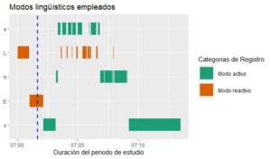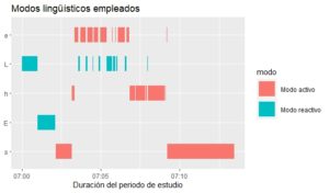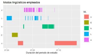 Como en el ejemplo del Gráfico de Gantt, en este caso también debe conformarse una base de datos que permita su fácil representación con el código descrito. Para ello, además de modificar la conformación original de la base, también hay que modificar el formato de las variables que indican el segundo de inicio y final de cada instancia de los modos lingüísticos (ML), para convertir los números en variables con formato de tiempo. La función que permite esta conversión es as.POSIXct() en la que se debe incluir como primer argumento la variable que contiene al tiempo en formato numérico y como segundo argumento un punto de referencia como origen a partir del cual se compara el paso del tiempo (origin=). Cuando la variable temporal con la que se cuenta ya tiene un formato de fecha y hora, no hace falta aplicar la función as.POSIXct() y es posible leer tal variable usando la función as.Date() para integrarla a la base de datos.