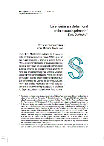Durkheim, É. (Septiembre-diciembre, 2002). La enseñanza de la moral en la escuela primaria. (M. Casillas, Trad.). Sociológica, (50), 153-170.