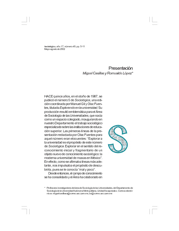 Casillas, M. A., & López, R. (2002). Presentación. Sociológica(49), 5-11.