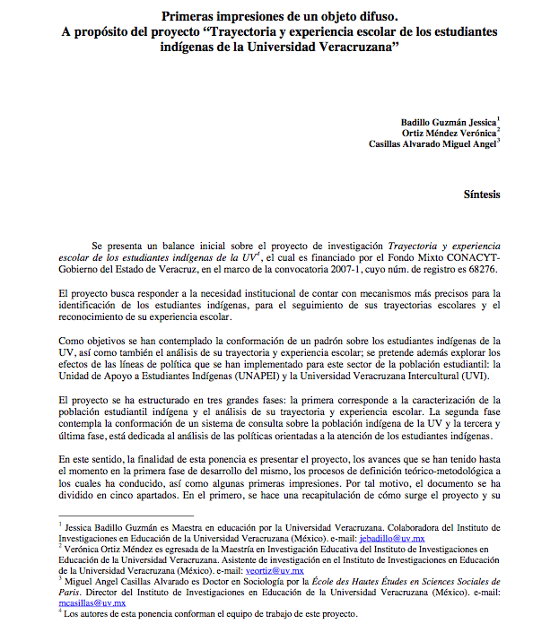 Badillo, J., Ortíz V., y Casillas, M. (2009). Primeras impresiones de un objeto difuso: A propósito del proyecto “Trayectoria y experiencia escolar de los estudiantes indígenas de la Universidad Veracruzana”. En L. S. Mateos (Comp.), Los estudios interculturales en Veracruz: Perspectivas regionales en contextos globales (pp.97-113). México: Universidad Veracruzana.