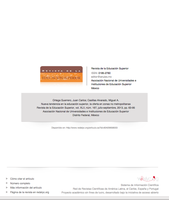 Ortega, J. C., y Casillas, M. A. (Julio-Septiembre, 2013). Nueva tendencia en la Educación Superior, la oferta en zonas no metropolitanas. Revista de la Educación Superior, (168) XLII(4), 63-95.