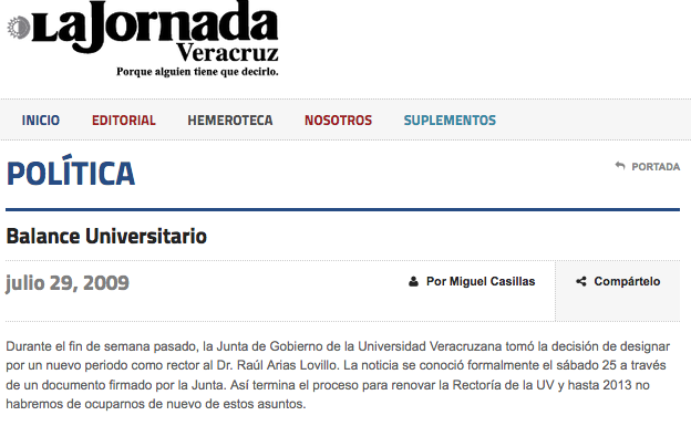 Casillas, M. A. (29 de julio de 2009). Balance universitario. La Jornada Veracruz. Recuperado de: http://jornadaveracruz.com.mx/Post.aspx?id=090729_205447_796