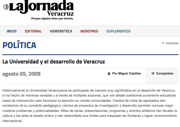 Casillas, M. A. (05 de agosto de 2009). La Universidad y el desarrollo de Veracruz. La Jornada Veracruz. Recuperado de: http://jornadaveracruz.com.mx/Post.aspx?id=090805_201224_687