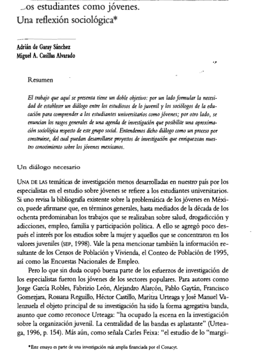 De Garay, A., y Casillas, M. A. (2002). Los estudiantes como jóvenes: una reflexión sociológica. En A. Nateras (Coord.), Jóvenes, culturas e identidades urbanas (pp. 245-262). México: Universidad Autónoma Metropolitana, Unidad Iztapalapa.