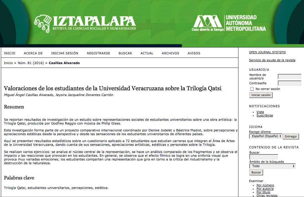 Casillas, M. A., y Dorantes, J. J. (Julio-Diciembre, 2016). Valoraciones de los estudiantes de la Universidad Veracruzana sobre la Trilogía Qatsi. Iztapalapa Revista de Ciencias Sociales y Humanidades, (81), 115-139.