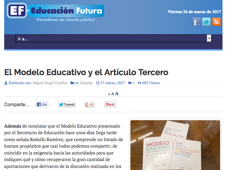 Casillas, M. A. (17 de marzo de 2017). El Modelo Educativo y el Artículo Tercero. Educación Futura. Recuperado de: http://www.educacionfutura.org/