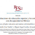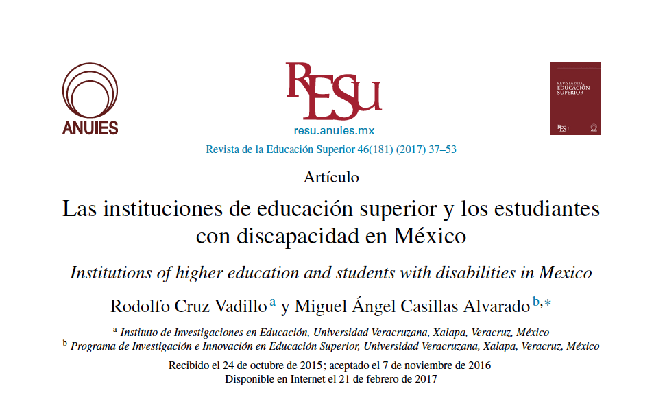 Cruz, R., y Casillas, M. A.. (Enero-marzo, 2017). Las instituciones de educación superior y los estudiantes con discapacidad en México. Revista de la Educación Superior, 46(181), 37-53.