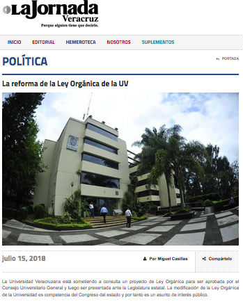Casillas, M. A. (15 de julio de 2018). La reforma de la Ley Orgánica de la UV. La Jornada Veracruz. Recuperado de: http://jornadaveracruz.com.mx/