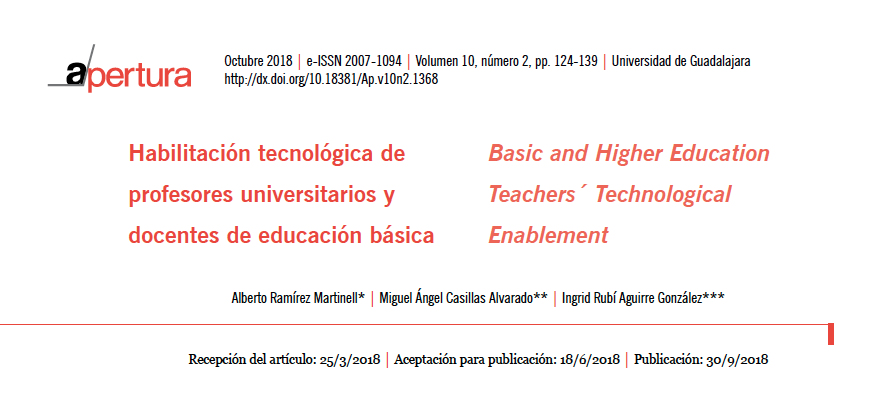 Ramírez-Martinell, A., Casillas, M. A., y Aguirre, I. R. (Octubre, 2018). Habilitación tecnológica de profesores universitarios y docentes de educación básica. apertura, 10(2), 124-139.