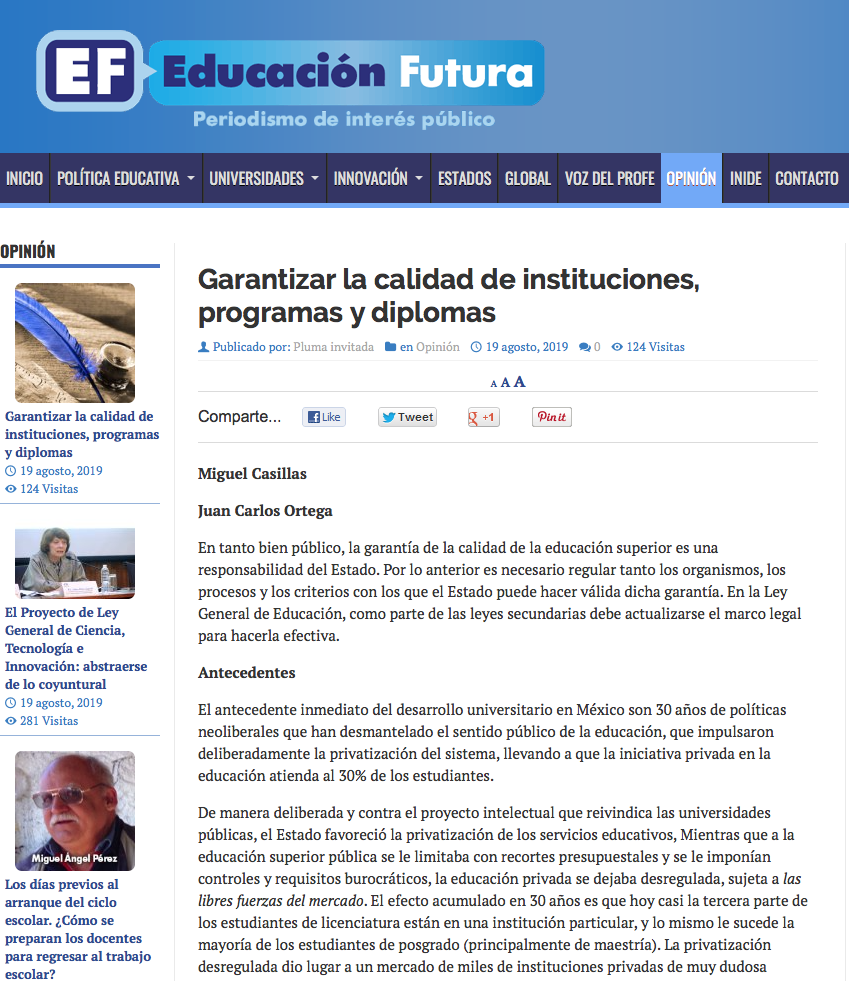 Ortega, J y Casillas, M. (20 de agosto de 2019). Garantizar la calidad de instituciones, programas y diplomas. Educación futura. Recuperado de: http://www.educacionfutura.org/