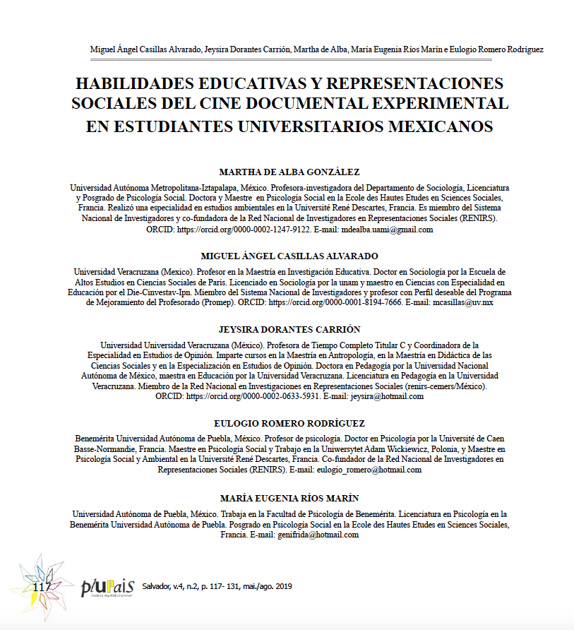 Casillas, Miguel., Dorantes Jeysira., De Alba Martha.,Rios, María y Romero, Eulogio. (Agosto 2019). Habilidades educativas y representaciones sociales del cine documental experimental en estudiantes universitarios mexicanos. Revista electrónica Plurais, revista multidisciplinar, 4 (2), 117-131. https://www.revistas.uneb.br/index.php/plurais/article/view/7114/4720