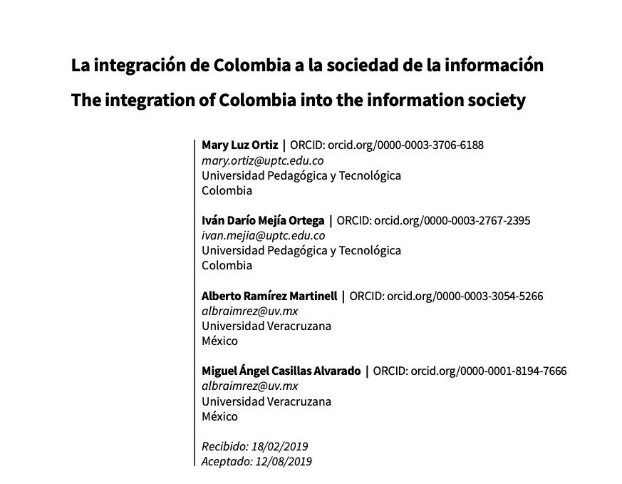 Ortiz Ortiz, M. L., Martinell, A. R., Mejía Ortega, I. D., & Casillas Alvarado, M. A. (2019). LA INTEGRACIÓN DE COLOMBIA A LA SOCIEDAD DE LA INFORMACIÓN. RevIISE – Revista De Ciencias Sociales Y Humanas, 14(14), 73-86. Recuperado de: http://www.ojs.unsj.edu.ar/index.php/reviise/article/view/312