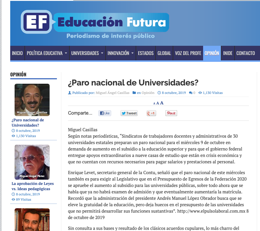 Casillas, M. (08 de octubre de 2019). ¿Paro nacional de Universidades?. Educación futura. Recuperado de: http://www.educacionfutura.org/