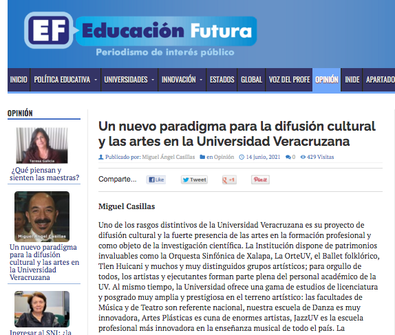 Casillas, M. (14 de junio de 2021). Un nuevo paradigma para la difusión cultural y las artes en la Universidad Veracruzana. Educación Futura. Recuperado de: https://suplementocampus.com