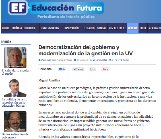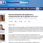 Casillas, M. (28 de junio de 2021). Democratización del gobierno y modernización de la gestión en la UV. Educación Futura. Recuperado de: http://www.educacionfutura.org/