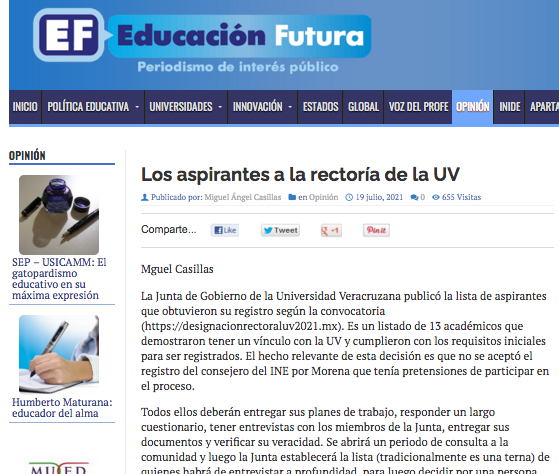 Casillas, M. (19 de julio de 2021). Los aspirantes a la rectoría de la UV. Educación Futura. Recuperado de: http://www.educacionfutura.org/