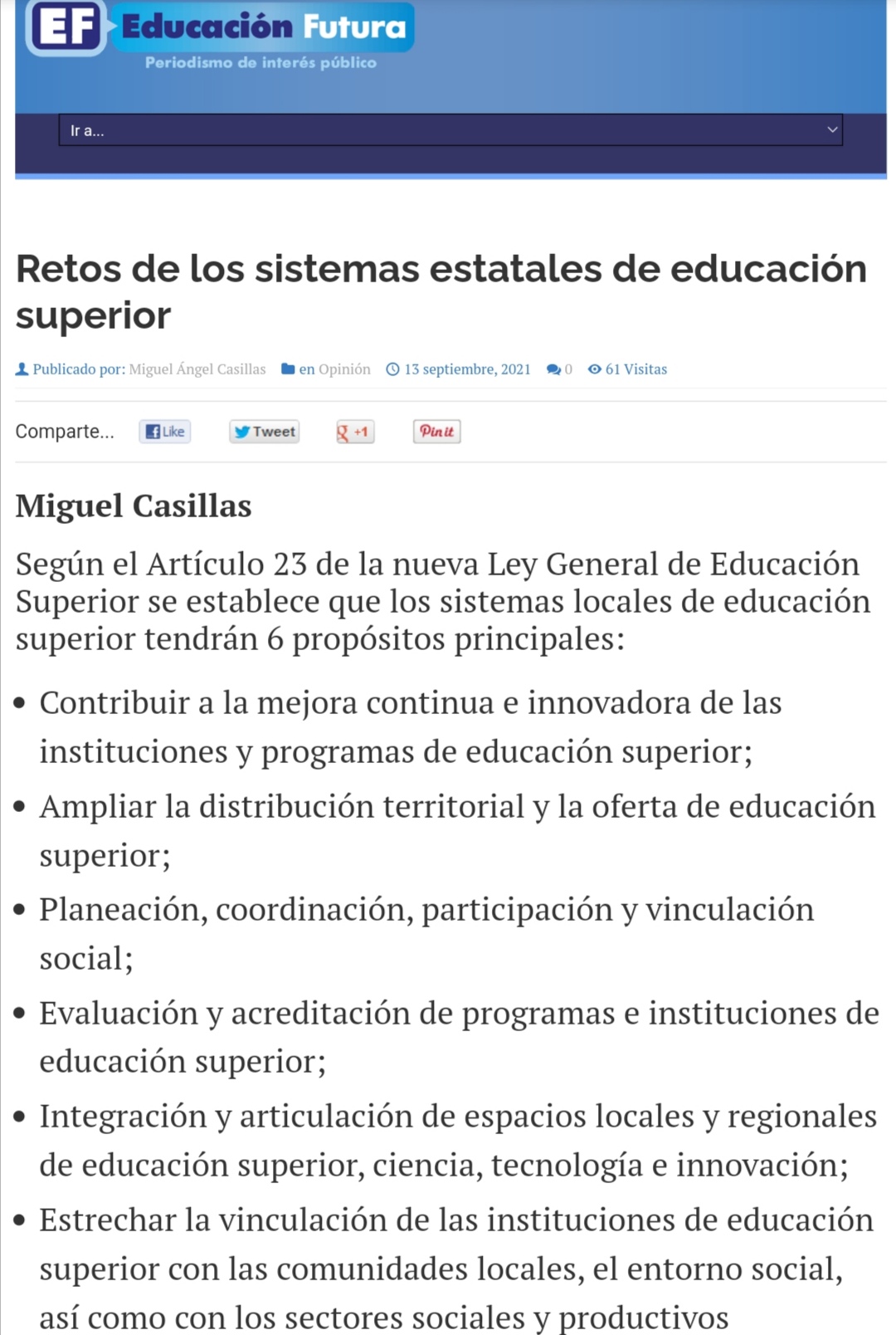 - Casillas, M. (13 de septiembre de 2021). Retos de los sistemas estatales de educación superior. Educación Futura. Recuperado de: http://www.educacionfutura.org