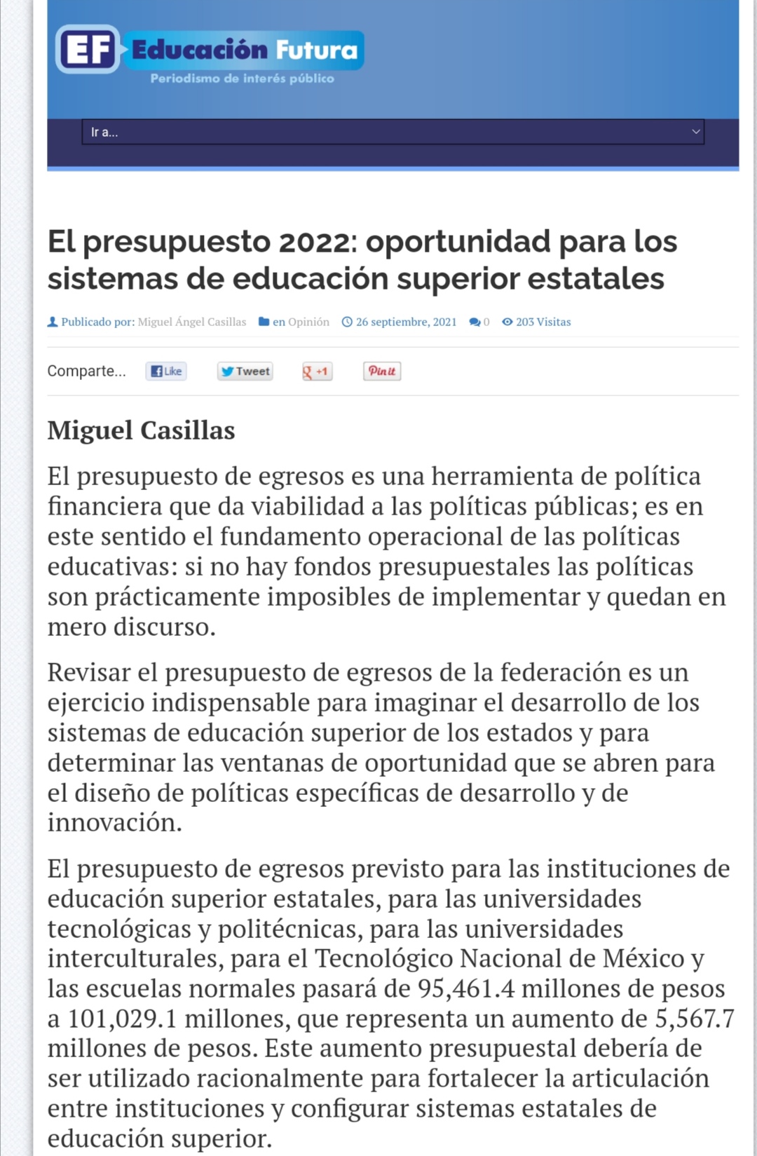 - Casillas, M. (26 de septiembre de 2021). El presupuesto 2022: oportunidad para los sistemas de educación superior estatales. Educación Futura. Recuperado de: http://www.educacionfutura.org