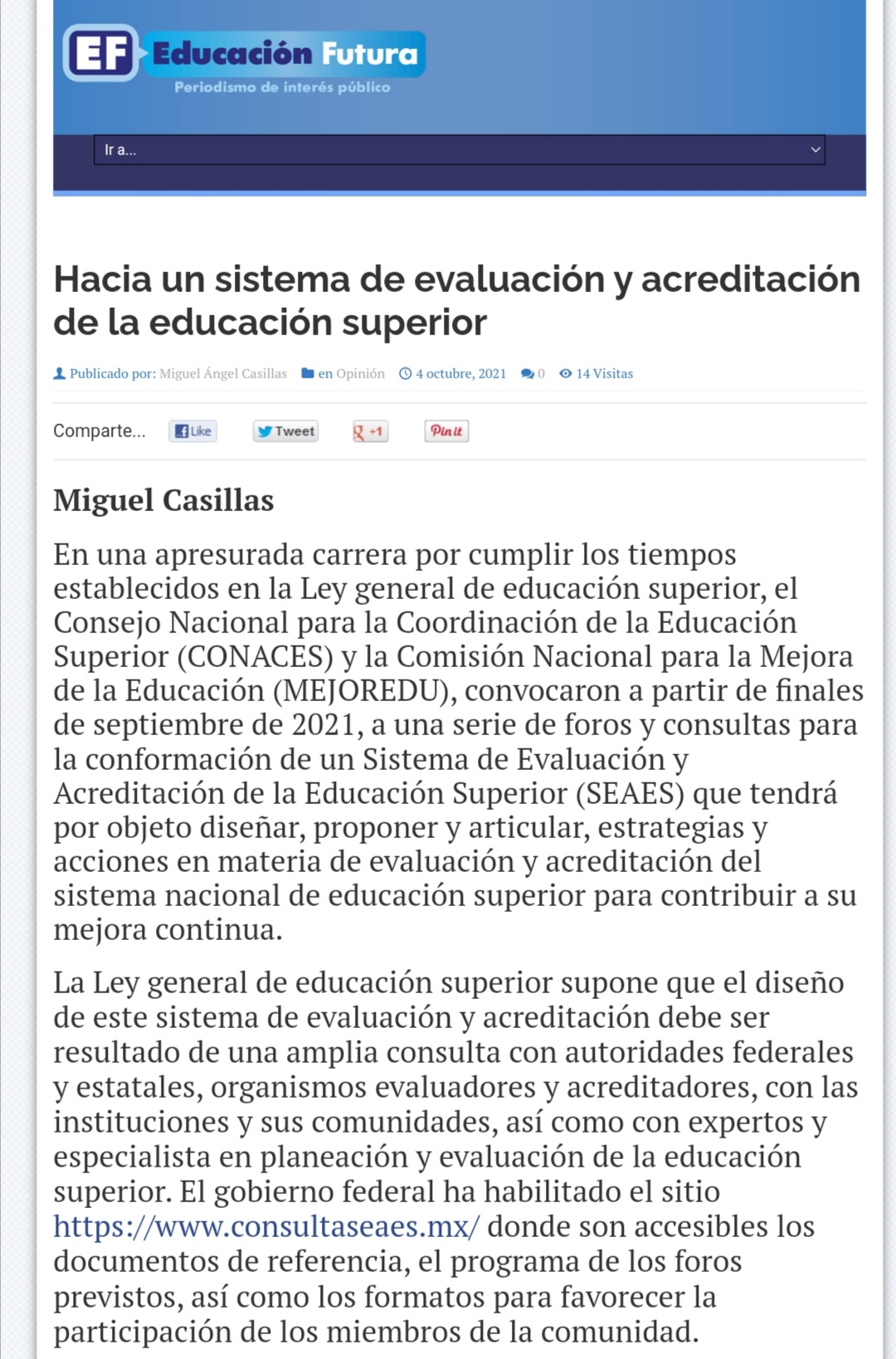 - Casillas, M. (04 de octubre de 2021). Hacia un sistema de evaluación y acreditación de la educación superior. Educación Futura. Recuperado de: http://www.educacionfutura.org