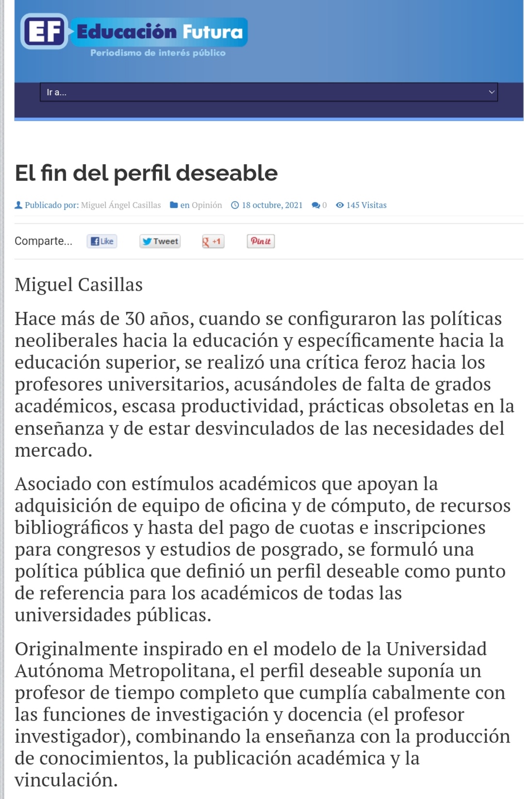 - Casillas, M. (18 de octubre de 2021). El fin del perfil deseable. Educación Futura. Recuperado de: http://www.educacionfutura.org/