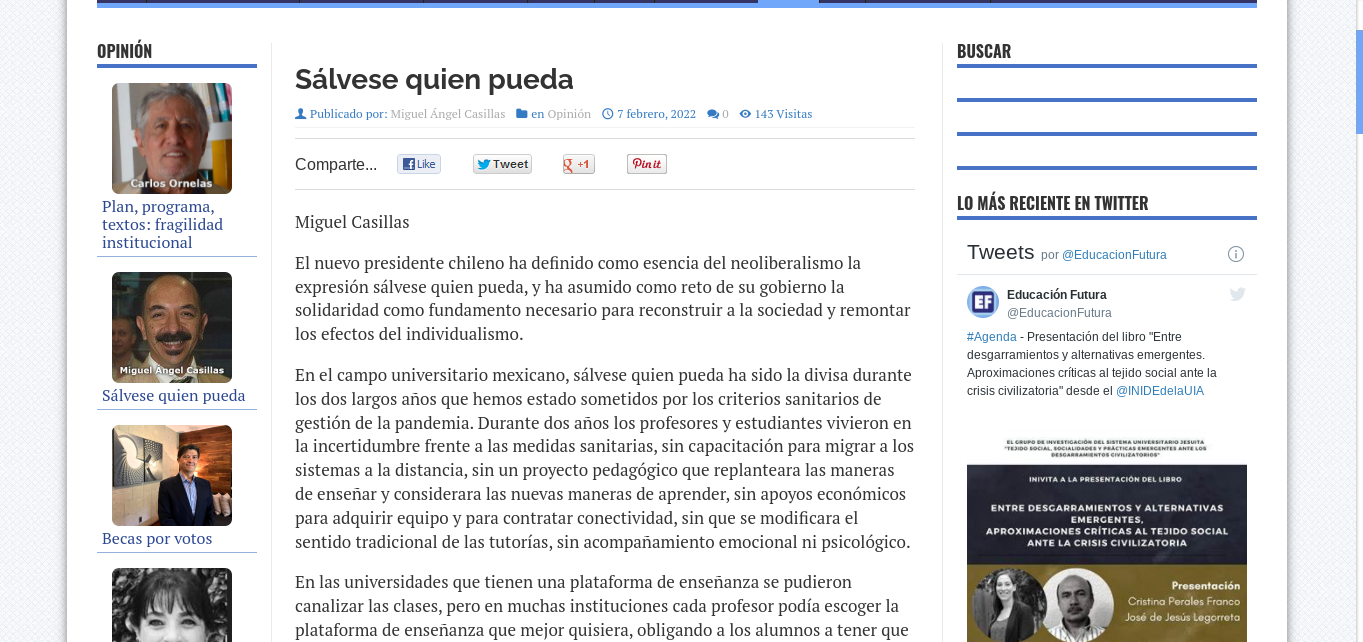 Casillas, M. (7 de febrero de 2022). Sálvese quien pueda. Educación Futura. Recuperado de: http://www.educacionfutura.org/