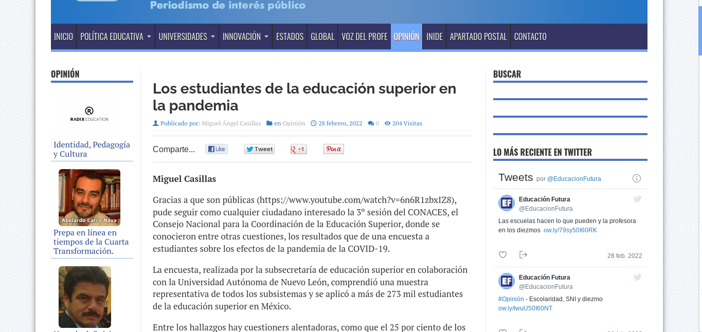 Casillas, M. (28 de febrero de 2022). Los estudiantes de la educación superior en la pandemia. Educación Futura. Recuperado de: http://www.educacionfutura.org/